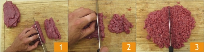 Para realizar el filete tártaro, lo primero que hay que hacer es cortar la carne en rodajas finas 1, luego reducirla a cubos 2 y finalmente picarla finamente con el cuchillo 3.