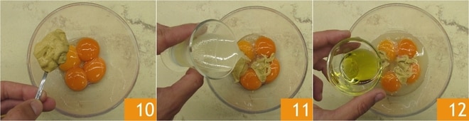 Mientras tanto, verted las yemas en otro bol y añadid la mostaza 10, el jugo de limón 11 y el aceite 12.