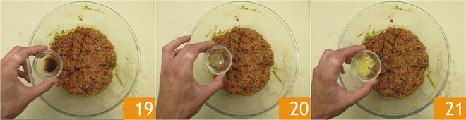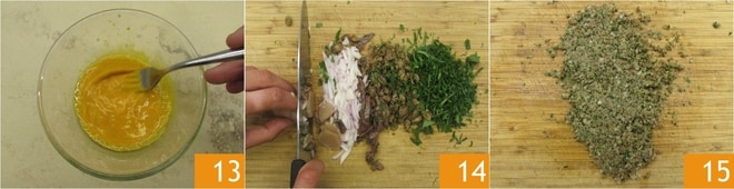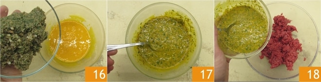 Añadid el picado a las yemas 16 y mezclad con un tenedor 17, luego unid la mezcla obtenida a la carne picada 18 y mezclad bien para amalgamarla con el condimento.