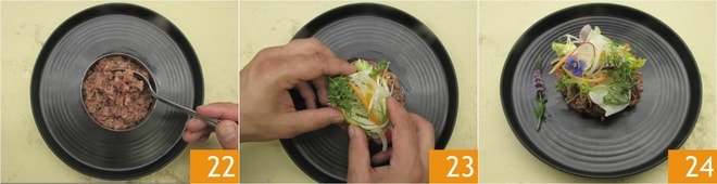 Mezclad y emplatar el tártaro con la ayuda de un aro de emplatar 22. Decorad con verduras frescas al gusto 23 y servid inmediatamente vuestro filete tártaro 24!
