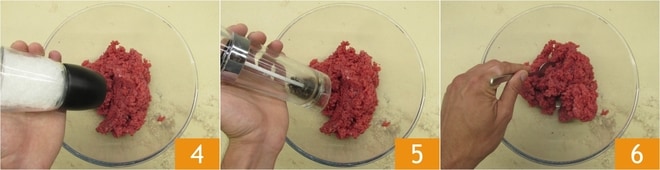 Poned la carne picada en un bol, condimentad con sal 4 y pimienta 5, luego mezclad bien 6.