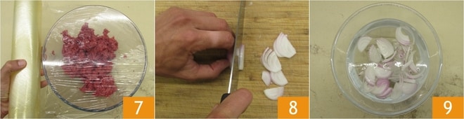 Tapad el bol con film 7 y ponedlo en la nevera mientras preparáis el resto de los ingredientes. Limpiad y cortad finamente el cebollino 8, luego dejadlo en remojo durante 5 minutos en un bol con agua fría a la que habréis añadido vinagre y sal 9.