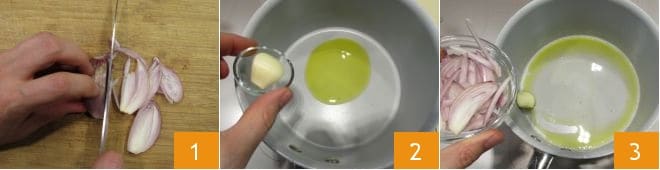 Para preparar los filetes de atún sobre crema de garbanzos y cebollas rojas, primero comenzad con la crema de garbanzos: limpiad y cortad la chalota 1. Calentad 10 g de aceite de oliva en una cacerola, añadid 1 diente de ajo pelado pero entero 2 y la chalota cortada 3.