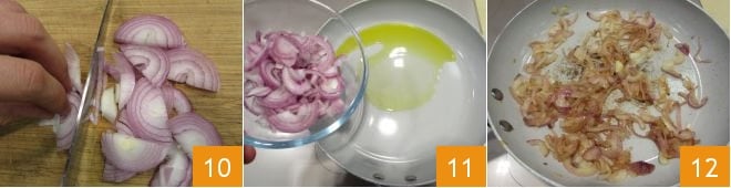 Mientras tanto, limpiad la cebolla roja y cortadla 10, en una sartén calentad 10 g de aceite de oliva y añadid la cebolla cortada 11, saltadla a fuego medio-alto durante unos 5 minutos o hasta que estén bien doradas y crujientes 12; removiendo de vez en cuando y al final de la cocción salpimentad.