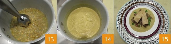 Mientras tanto, los garbanzos habrán terminado la cocción, trituradlos con una batidora de inmersión 13 para obtener una crema suave y sin grumos 14. Componed vuestro plato distribuyendo en el fondo una capa de crema de garbanzos, encima una de cebollas tostadas en sartén y para finalizar colocad los filetes de atún escurridos, completad con pimienta al gusto y algunas hojas de eneldo. Distribuid los ingredientes equitativamente en los 4 platos de servir: ¡los filetes de atún sobre crema de garbanzos y cebollas rojas están listos para ser servidos 15!