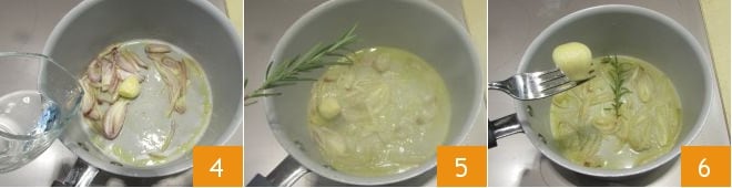 Verted un poco de agua 4, aromatizad con una ramita de romero 5 y dejad que la chalota se ablande durante unos 5 minutos a fuego moderado, removiendo de vez en cuando. Eliminad el diente de ajo 6