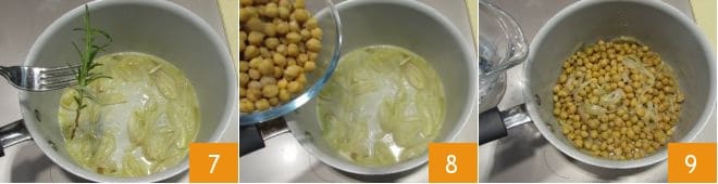 y la ramita de romero 7, salpimentad y añadid los garbanzos 8, verted agua 9 hasta cubrirlos y continuad la cocción durante unos 20 minutos o hasta que los garbanzos estén bien tiernos.