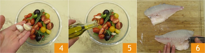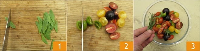 Para preparar los filetes de dorada al horno, lo primero que hay que hacer es ocuparse de las verduras, después de lavarlas cortad las judías planas en trozos 1 y los tomatitos de colores por la mitad 2. Ponedlos en un bol y aderezad con romero 3.