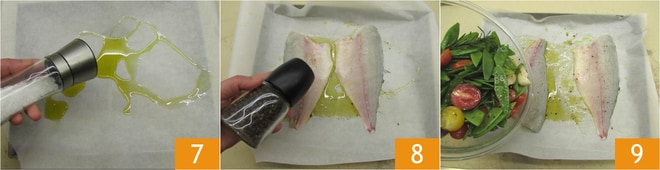 En una bandeja forrada con papel de horno, verted un chorrito de aceite, sal 7 y pimienta. Colocad encima los filetes de dorada y aderezadlos con una pizca de pimienta 8 y sal. También añadid las verduras 9.