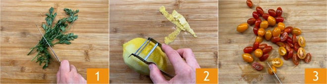 Para preparar los filetes de dorada en sartén, pica el perejil 1, cuidando de reservar los tallos, pela el limón para obtener la cáscara 2, finalmente lava y divide a la mitad los tomatitos 3.