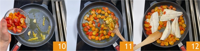 En el fondo de cocción puedes añadir los tomatitos 10. Déjalos chisporrotear durante unos 10 minutos, o hasta que la pulpa esté ablandada. Luego, retira las cáscaras, el ajo y los tallos del perejil 11. Ajusta de sal, añade los filetes de dorada y deja cocinar 2 minutos más, el tiempo suficiente para que se impregnen de sabor 12.