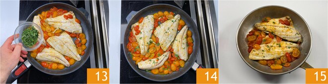 Gira suavemente y sirve con el perejil picado 13. Los filetes de dorada en sartén están listos 14, sírvelos bien calientes 15.