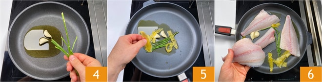En una sartén muy ancha deja calentar a fuego bajo, durante 5 minutos, el aceite con los dientes de ajo, los tallos de perejil 4 y las cáscaras de limón 5. Pasado el tiempo, sube un poco el fuego y coloca los filetes de dorada con la piel hacia abajo 6.