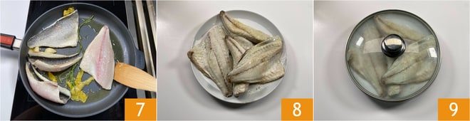 Apenas cambien de color, después de unos 2 minutos, dales la vuelta y continúa la cocción por otros 2 minutos 7. Cuando estén listos, colócalos en un plato 8 y cúbrelos 9.