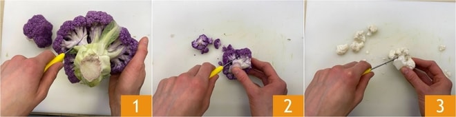 Para preparar los filetes de lubina al horno, lo primero es lavar las verduras. Comienza por la coliflor morada, separa los floretes 1 y divídelos en floretes más pequeños 2. Haz lo mismo con la coliflor blanca 3.