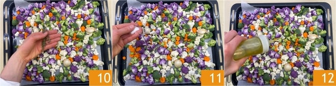 Agrega el tomillo limón 10, la sal 11, la pimienta y un chorrito de aceite 12. Masajea las verduras para uniformar el condimento y cocina en horno estático precalentado a 180° durante 20 minutos.