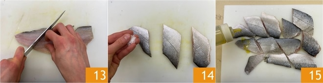Mientras tanto, pasa a los filetes de lubina. Asegúrate de que no haya espinas, de lo contrario, elimínalas con unas pinzas. Luego corta cada filete en 3 piezas, realizando un corte oblicuo 13. Sala la lubina 14 y condiméntala con el aceite 15. Masajea para uniformar el condimento.
