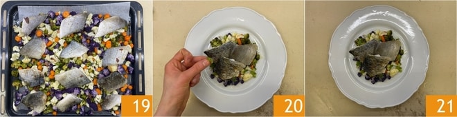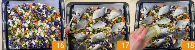 Cuando las verduras estén tiernas, sácalas del horno 16. Coloca encima los filetes de lubina con la piel hacia arriba y sobre cada uno pon un trocito de anchoa 17. Condimenta nuevamente con un chorrito de aceite 18.