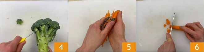 Luego toma también los floretes del brócoli 4. Pasa a las zanahorias, pélalas 5 y córtalas en rodajas 6.