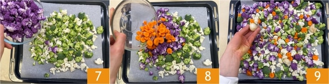 En una bandeja forrada con papel de horno, vierte los brócolis y las coliflores 7; agrega también las zanahorias 8 y los 3 dientes de ajo sin pelar 9.