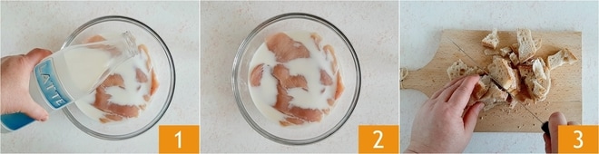 Para preparar las chuletas de pollo al horno coloca las lonchas en un bol grande, añade la leche 1, cubre con film y deja en remojo durante unos 30 minutos 2. Puedes dejarlo a temperatura ambiente, o guardarlo en el frigorífico si hace demasiado calor. Este paso hará que las chuletas queden muy tiernas. Mientras tanto corta el pan en cubos 3.