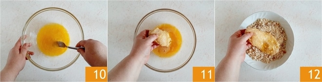 Sigue batiendo hasta que se absorba bien 10. Toma una loncha de pechuga de pollo enharinada y pásala por huevo por ambos lados 11, luego escurre el exceso de huevo y transfiérela al bol con el pan rallado 12.