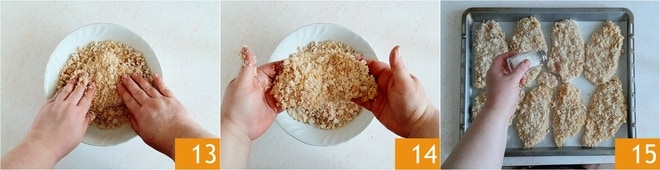 Empana ambos lados, presionando con las manos 13 para que el pan se adhiera bien 14. Coloca las chuletas en una bandeja de horno forrada con papel de hornear y sigue así con las demás. Añade una pizca de sal 15.