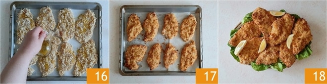 Rocíalas con un poco de aceite 16 y hornéalas en horno estático precalentado a 200°C durante unos 25-30 minutos, en la rejilla media-baja. El tiempo de cocción puede variar según el horno y el tamaño de las chuletas. Una vez cocidas y bien doradas, sácalas del horno 17. Coloca en un plato para servir con hojas de lechuga y rodajas de limón 18, luego sírvelas inmediatamente.
