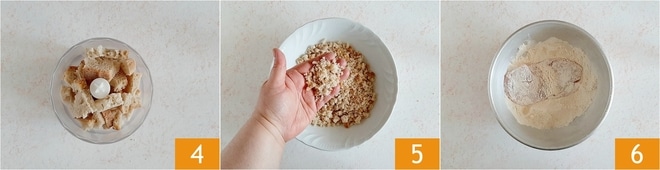 Transfiere los cubos al interior de un procesador de alimentos 4 y tritura a máxima velocidad, obteniendo un pan rallado grueso y rústico. Transfiérelo a un bol grande 5. Toma una loncha de pechuga de pollo, escurre el exceso de leche y pásala por harina por ambos lados 6.