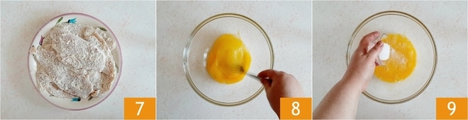 Repite la misma operación para las demás y mientras tanto ve colocándolas en un plato 7. Rompe los huevos en otro recipiente, bátelos ligeramente 7, y añade la sal 9.