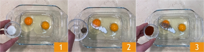 Para preparar los filetes de pollo en freidora de aire, empezad colocando las lonchas de pechuga de pollo sobre una tabla. Si están demasiado gruesas, golpeadlas ligeramente con un ablandador hasta obtener un grosor uniforme de aproximadamente 1 cm. En una fuente, rompéis los huevos y sazonad con la sal 2, la pimienta negra 2 y la paprika dulce 3.