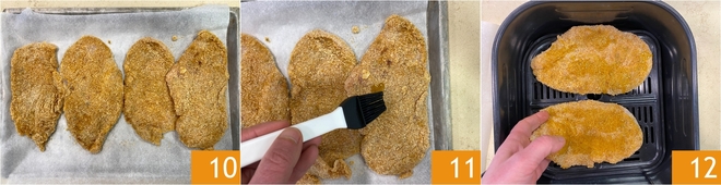 Continuad así con todas las lonchas, colocándolas a medida en una bandeja forrada con papel de horno 10, luego pinceladlas ligeramente con aceite por ambos lados 11. Precalentad la freidora de aire a 2000 durante unos minutos y, a continuación, colocad los filetes en la cesta sin superponerlos (cocinad 2 a la vez, según el tamaño de la cesta) 12; nosotros hemos usado una freidora de aire de 6,5 l.