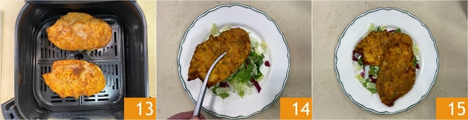 El empanado enriquecido con especias aporta un toque aromático que los diferencia de los habituales Escalopes empanados, mientras que la cocción en freidora de aire los deja ligeros y bien dorados. Perfectos para poner en la mesa incluso en el último momento, los filetes de pollo empanados en freidora de aire gustan a todos y se pueden acompañar con guarniciones frescas, patatas al horno y salsas al gusto... ¡pruébalos también en un bocadillo!