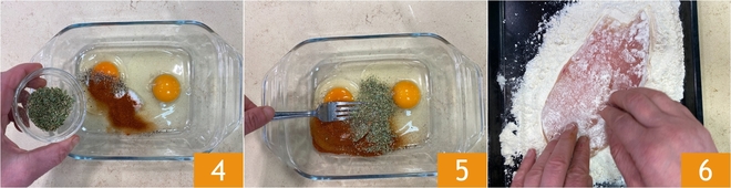 Añadid también el orégano seco 4 y batid todo con un tenedor 5. Echad la harina en una bandeja y el pan rallado en otra. Pasad cada loncha de pollo primero por la harina, cubriéndola completamente 6.