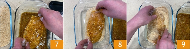 Luego sumergidla en los huevos 7 y por último empanadla en el pan rallado 8, presionando bien con las manos para que el empanado se adhiera por todos los lados 9.
