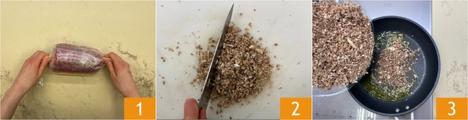 Para preparar el solomillo Wellington, lo primero es hacer el Caldo de carne, teniendo cuidado de salarlo moderadamente. Elimina la grasa en exceso del solomillo de ternera, luego envuélvelo muy ajustado en film transparente 1. Deja reposar en el frigorífico durante 30 minutos. Mientras tanto, limpia los champiñones y pícalos finamente con un cuchillo 2. En una sartén calienta un poco de aceite, luego añade el ajo y los champiñones 3.
