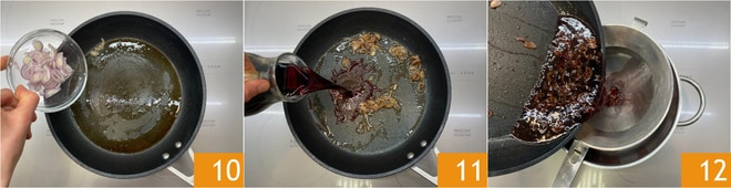 En la sartén donde has cocido el solomillo, pon la chalota cortada finamente y enharinada 10. Sofríe durante unos minutos, luego rocía con vino tinto 11. Cuando toda la parte alcohólica se haya evaporado, filtra todo a través de un colador recogiendo el líquido en una olla 12.
