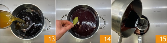 Añade el caldo de ternera 13, una hoja de laurel 14 y reduce al fuego hasta tres cuartos; deberás obtener una salsa ni demasiado líquida ni demasiado densa. Filtra de nuevo 15.