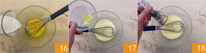 Dedícate ahora a la preparación de las crepes: en un bol bate el huevo, luego añade la leche 16 y la mantequilla derretida y atemperada 17. Ajusta de sal y pimienta 18.