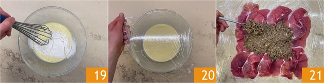 Añade también la harina 19 y mezcla con unas varillas hasta obtener una mezcla homogénea y sin grumos. Cubre con film transparente y deja reposar en el frigorífico durante 30 minutos 20. Extiende el jamón serrano en una hoja de film transparente superponiendo ligeramente las lonchas para formar un rectángulo, luego distribuye encima una capa de champiñones 21.