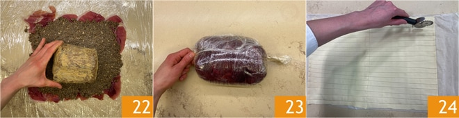 Coloca el solomillo de ternera sobre los champiñones 22, luego enrolla las lonchas de jamón alrededor de la carne envolviéndola ajustadamente en el film transparente. Cierra bien en forma de caramelo 23 y colócalo en el frigorífico durante 30 minutos. Mientras, corta el hojaldre en tiras de 2 cm de ancho 24.