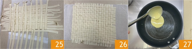 Comienza a entrelazar las tiras 25 hasta formar una trama similar a la de una cesta de mimbre 26 y reserva. Recoge la masa para las crepes y mézclala para que se recupere. Unta con la mantequilla una sartén antiadherente y, una vez que esté bien caliente, vierte un cucharón de masa en el centro. Gira la sartén para cubrir todo el fondo con la mezcla 27.
