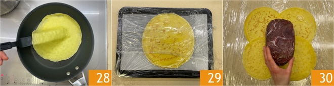 Cocina durante un minuto a fuego medio-bajo; cuando notes que los bordes comienzan a despegarse, dale la vuelta a la crepe 28 y cocina también del otro lado. Repite el mismo procedimiento hasta que se agote la masa, con estas cantidades deberías obtener 4 crepes. Apílalas en una bandeja cubierta con papel de horno y cubre con film transparente 29, de esta manera se mantendrán blandas hasta el momento de uso. Cuando haya transcurrido el tiempo de reposo del solomillo, coloca las crepes sobre una hoja de film transparente superponiéndolas ligeramente, luego coloca el solomillo en el centro 30.