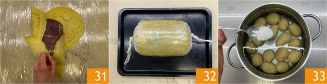 Cúbrelo con las crepes 31, luego envuélvelo todo en el film transparente, cerrando en forma de caramelo 32. Deja reposar en el frigorífico durante 30 minutos. Mientras, dedícate a la preparación del puré de patatas: cuece las patatas partiendo de agua fría con sal 33, necesitarás unos 30-40 minutos dependiendo del tamaño. Mientras tanto, calienta la leche en un cazo aparte.