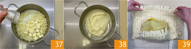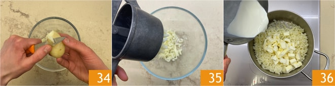 Después de verificar la cocción con un tenedor, escurre las patatas y deja enfriar durante unos minutos, luego elimina la piel 34. Tritura las patatas 35 y transfiérelas a una olla, después añade la mantequilla y la leche caliente 36.