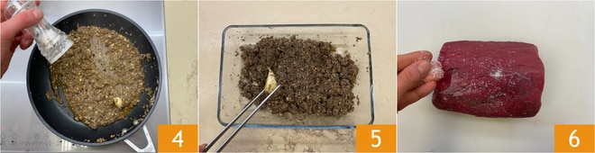 Ajústalos de sal y pimienta 4 y cocina a fuego fuerte hasta que se sequen. Transfiérelos a un bol 5 y déjalos enfriar completamente. Recoge el solomillo y sazona con sal 6.