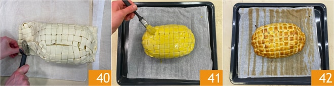 Corta el exceso de hojaldre 40. Transfiere el solomillo a una bandeja cubierta con papel de horno y unta el hojaldre con la yema de huevo 41. Cocina en horno ventilado precalentado a 180° durante 35-40 minutos, dependiendo del grado de cocción deseado 42.