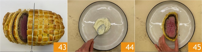 Una vez horneado, deja reposar el solomillo durante unos minutos antes de cortarlo en rebanadas 43. Emplata distribuyendo en el fondo del plato el puré de patatas 44, luego coloca encima la rebanada de solomillo 45.