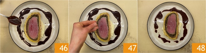 Completa con la salsa de vino tinto 46 y una pizca de sal de Maldon 47. ¡Tu solomillo Wellington está listo para ser servido 48!