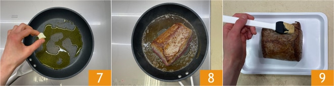En una sartén, vierte un poco de aceite y la mantequilla 7, luego déjala derretir. Dóralo por todos los lados del solomillo hasta que esté dorado 8. Deja enfriar y úntalo por todos los lados con la mostaza 9.